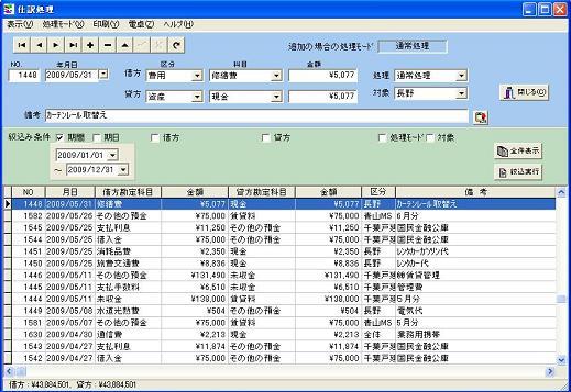 最下欄にあるステータスバーに絞込み実行の結果表示されているリストの借方合計、貸方合計が表示されます。