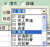 | 借方 | 借方のチェックボックスをクリックしマークすると分類のプルダウンメニューが選択可能になります。借方区分を指定して下さい。 詳細のチェックボックスをクリックしマークすると科目のプルダウンメニューが選択可能になります。勘定科目を指定して下さい。 *分類だけの指定も可能です。 |