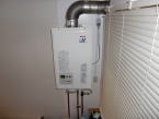ネットでプロパン用給湯器を買いました。屋内設置で設置スペースが狭いため壁掛け式で探しました。出力は余裕をみて20号としました。給湯器自体は安いものを買うことができましたが排気用のダクト類は工事を頼んだ業者さんに用意してもらいましたがこれが結構いい値段でした。ネットで買う際セットで買うともっと安く済ませたかもしれません。設置場所の壁に強度を確保するためコンパネ450mm×900mmを上下に2枚白に塗装し設置しました。あと電源を給湯器用と洗面用に配線しておきました。温水・冷水用の配管も事前に準備しておきました。
