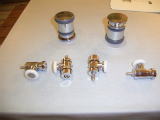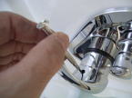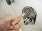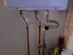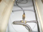 シャワー用の給水・止水の金具は温度調節とボディシャワー用の水栓が一箇所に集まっています。裏側の配管はお湯・水の銅管をシャワーユニットの裏側まで配管しました。それをアルミのフレキ管で繋ぎました。最後に断熱テープを巻いて完成です。
