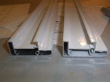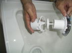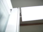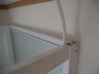 水漏れ防止用に白い部材を詰めます。黒い部材は磁石になっています。扉側にもついていて磁石の力で扉がきっちり閉じる構造になっています。また、扉は左右どちらにも開閉させるようセットすることができます。扉の開閉は金具についているローラーがレールの上をスライドすることにより開閉する構造です。