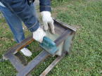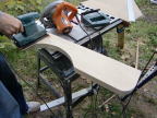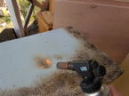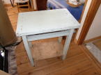 昔の小学校で使用していた机が家にあったのでこれを利用することにしました。ペンキを塗ってありましたが剥がして利用することにしました。携帯用のバーナーで表面の塗料を焼くと比較的容易にペンキを剥がすことができます。最後にサンダーで仕上げます。