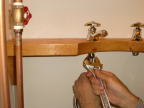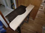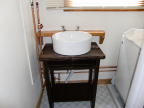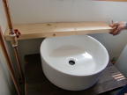 蛇口を固定する棚を2×6で作りした。洗面ボウルの形に合わせてジズソーで切り取りサンダーで仕上げます。温水と冷水用の蛇口を取り付ける穴を2箇所にあけ、塗料はVATONのパインで仕上げました。