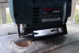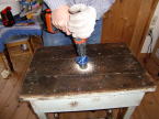 洗面ボールに付いていた排水用のパイプの直径にあわせて穴をあけたところ締め付け用の金具が台にあたり安定しなかったため再度ジグソーで大きい穴をあけなおしました。