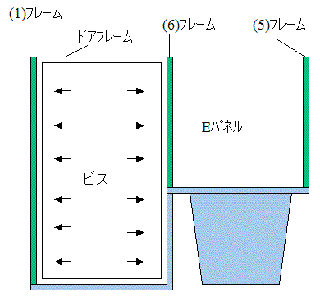 ドアパネルを付ける前に縦フレーム(6)の穴にあわせEパネルの側面ににドリルで穴を空けビスで固定します。