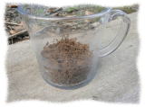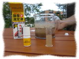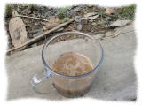 (1)シャベルで土を100円ショップで買ってきた透明のカップに採取しました。量は土1に対し水2の割合ということなので1cmぐらいにしました。